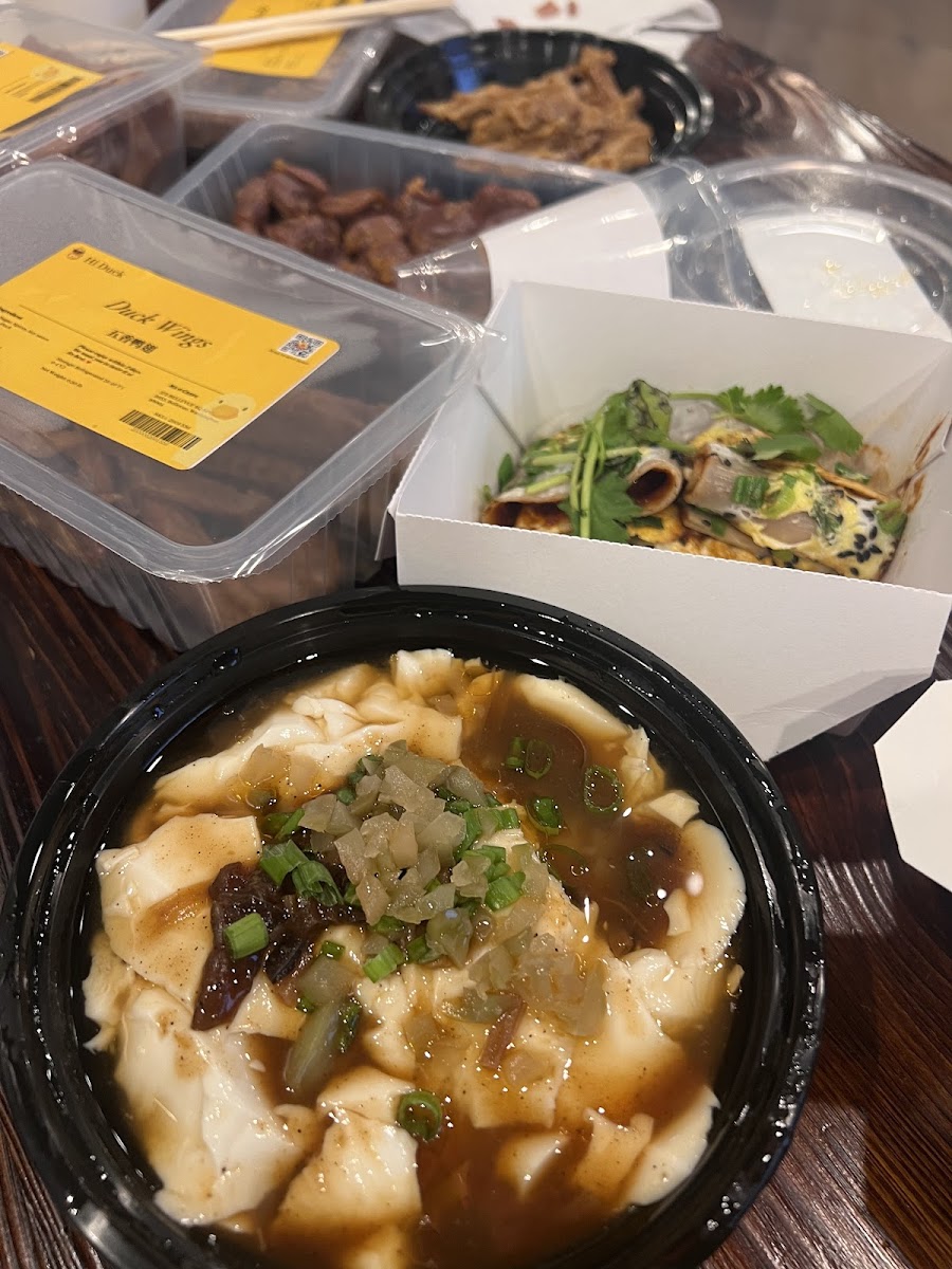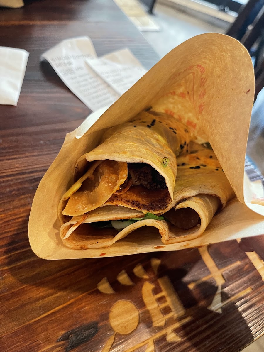 The menu centers around traditional Chinese pancakes, known here as “origin crepe” or 传统煎饼, alongside other items like cold grilled noodles and options with Peking duck, cumin lamb, and spicy crawfish. Portions tend to be generous—an order often includes two crepes—making it a satisfying choice for those looking for hearty, flavorful bites without the formality of a sit-down meal.