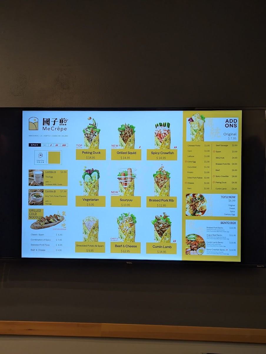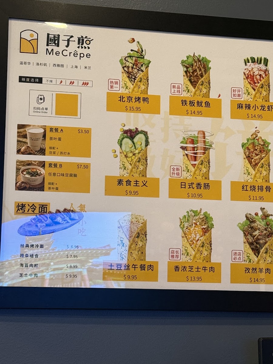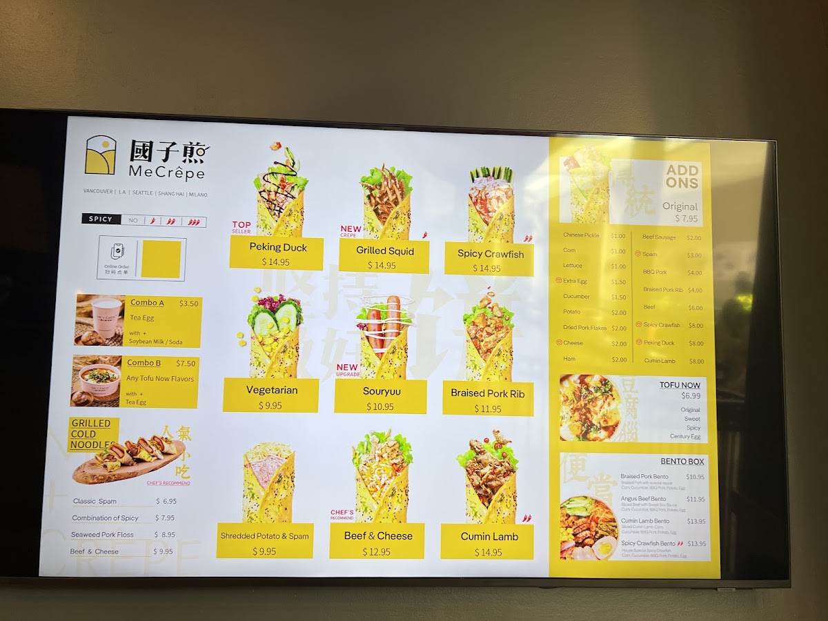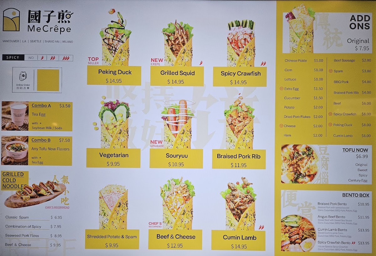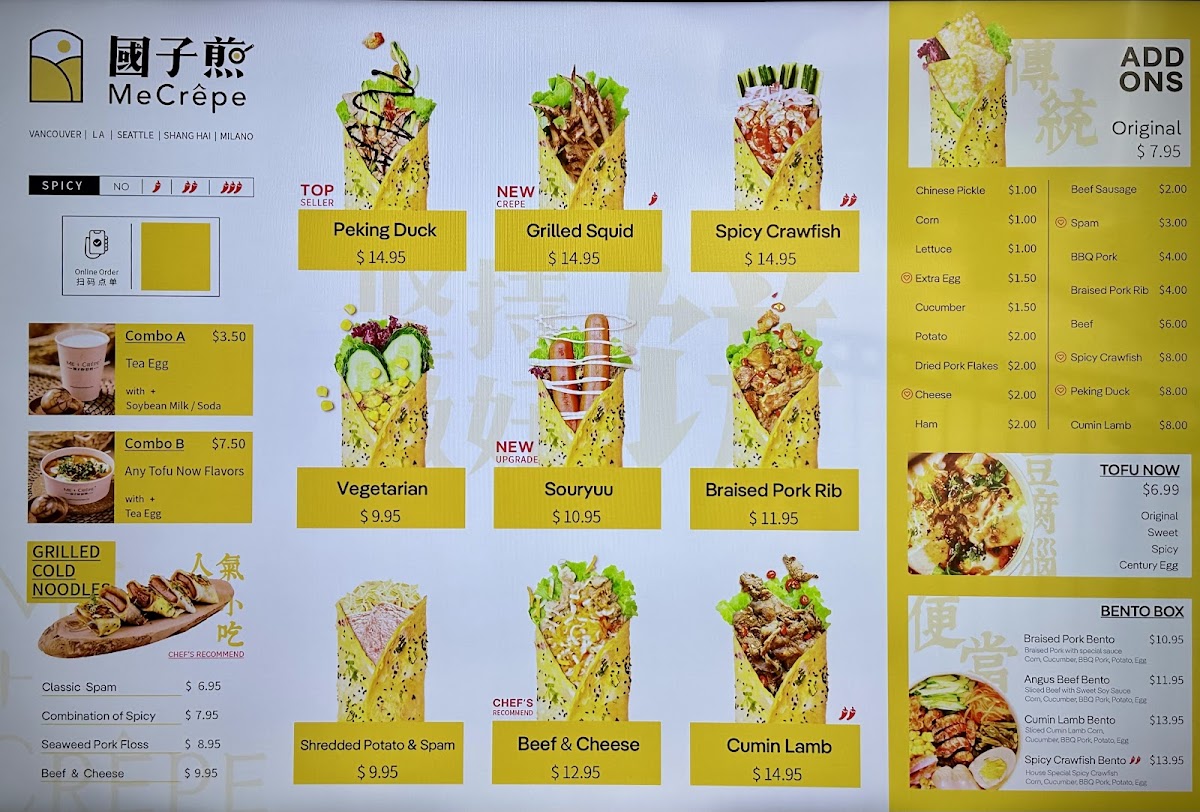 Additionally, some menu highlights include Cold Noodles, Tea Infused Egg, origin crepe traditional pancake 传统煎饼, and Sukiyaki. This menu is suited for those seeking quick meals or casual dining options, with ordering typically done to-go via tablet devices. Portions are designed to provide substantial servings, often involving two crepes per order.